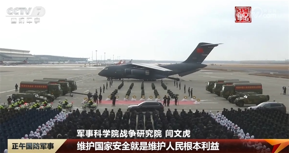 守護(hù)國防安全,我們每個人都是衛(wèi)士。今年11月,我們第十次迎回了抗美援朝保家衛(wèi)國的烈士遺骸。11月23日上午,遼寧沈陽桃仙國際機(jī)場,兩架殲-20戰(zhàn)機(jī)護(hù)航運(yùn)-20運(yùn)輸機(jī)呼嘯而來,運(yùn)-20降落,緩緩?fù)ㄟ^水門,以最高禮儀致敬英烈。