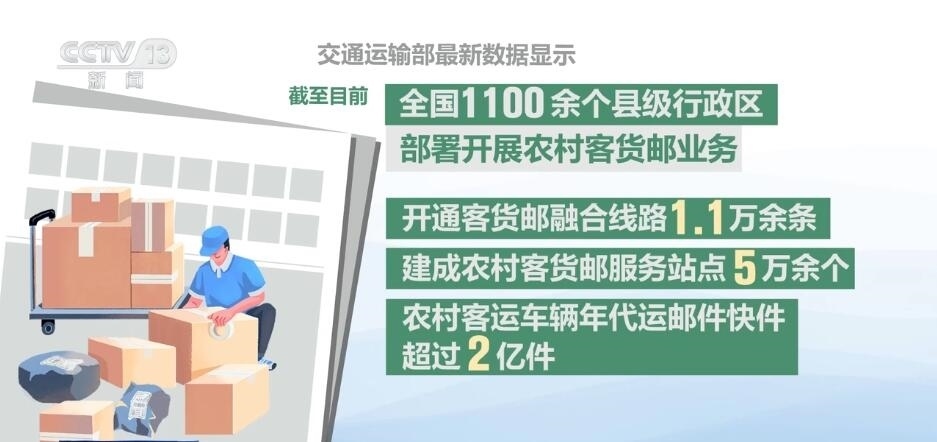 交通運(yùn)輸部最新數(shù)據(jù)顯示,截至目前,全國1100余個縣級行政區(qū)部署開展農(nóng)村客貨郵業(yè)務(wù),開通客貨郵融合線路1.1萬余條,建成農(nóng)村客貨郵服務(wù)站點5萬余個,農(nóng)村客運(yùn)車輛年代運(yùn)郵件快件超過2億件。