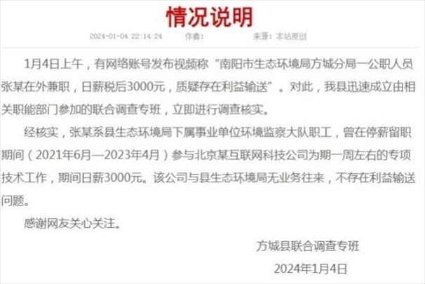 ·南陽調(diào)查“公務(wù)員兼職日薪三千”:停薪留職期間曾參與一周專項(xiàng)技術(shù)工作,不存在利益輸送。