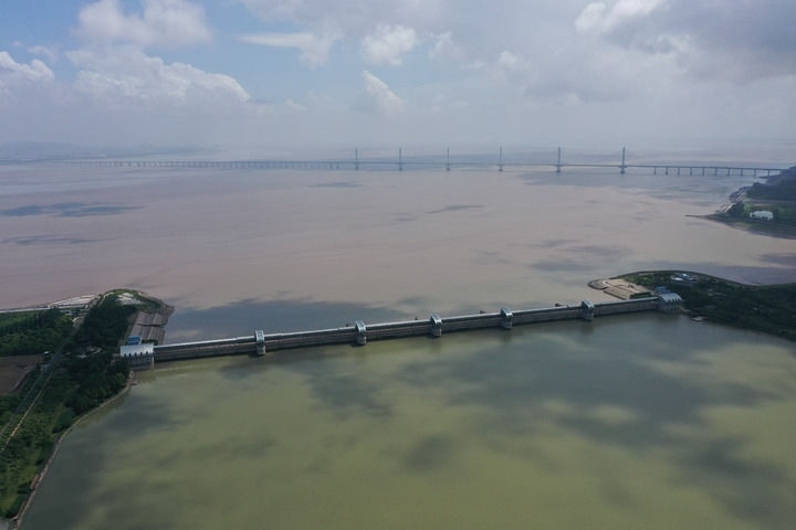曹娥江大閘是我國強涌潮河口地區(qū)第一大閘,浙東水資源配置重要樞紐工程(2023年8月4日攝,無人機照片)。新華社記者 黃宗治 攝