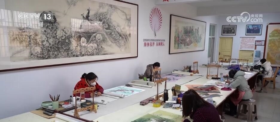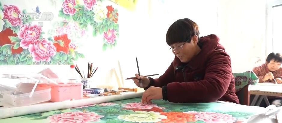 在巨野縣大義鎮(zhèn)王莊村這家新開的畫室里,十幾位村民正在這里專心畫工筆牡丹畫。今年50多歲的曹春靈算是村里的老畫師了,平常農忙的時候她就照顧家里10多畝地,農閑的時候就作畫,每個月能掙兩三千塊錢。這不臨近春節(jié)畫賣得好,她干脆把兒媳婦也叫過來,她今年的新打算是,要把兒媳培養(yǎng)成畫師。