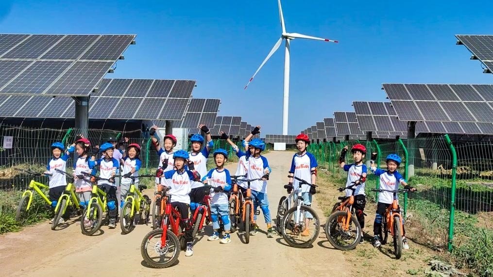 圖為研學(xué)團的小朋友們騎行參觀小王莊鎮(zhèn)光伏電站。新華社發(fā)(李暢攝)