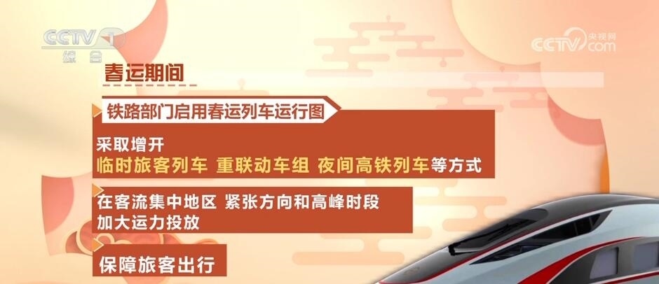 春運期間,鐵路部門啟用春運列車運行圖,采取增開臨時旅客列車、重聯(lián)動車組、夜間高鐵列車等方式,在客流集中地區(qū)、緊張方向和高峰時段加大運力投放,保障旅客出行。國鐵濟南局春運期間安排臨客超90對,其中開行去往北京、上海、石家莊、哈爾濱、福州等方向跨省臨客47對。國鐵武漢局春運首日加開臨客49對,哈爾濱鐵路部門安排開行臨客列車74對,太原鐵路部門安排開行臨客列車64對。