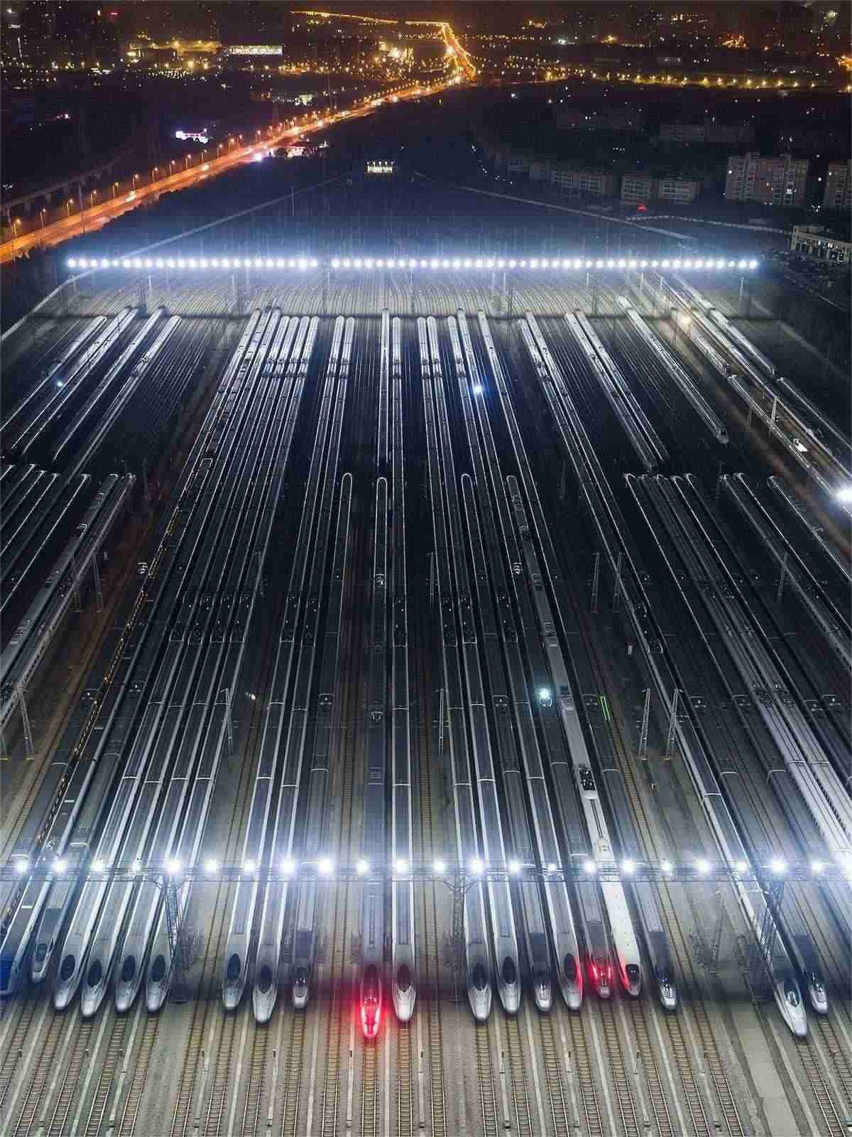 1月26日凌晨1時(shí)許,春運(yùn)前夜,在武漢動(dòng)車(chē)段的存車(chē)線上,一列列完成檢修的動(dòng)車(chē)組集結(jié)完畢,猶如“陸地航母”一般,蓄勢(shì)待發(fā),迎接春運(yùn)。(湖北日?qǐng)?bào)全媒記者 任勇 通訊員 許輝 劉博洋 攝)