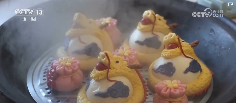 在黑龍江樺南縣,為了圖個(gè)熱鬧、沾個(gè)喜氣,誰(shuí)家蒸花饃,鄉(xiāng)里鄉(xiāng)親都會(huì)前來(lái)幫忙。在村民張瑞雪家里,大家圍坐在桌前,小小面團(tuán)通過(guò)“一印、二捏、三鑲”等技法,再起鍋開(kāi)蒸,就變成了精美的龍年花饃。這些花饃形態(tài)各異,有的威武雄壯、有的憨態(tài)可掬,不僅外觀吸引人,更承載著美好的新年祝福。