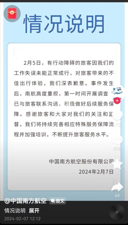 ·網(wǎng)友稱成功申請(qǐng)坐輪椅獨(dú)飛后遭拒載,南航道歉:工作失誤致旅客未能正常成行。