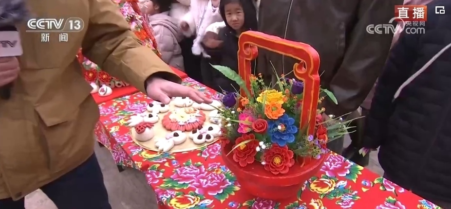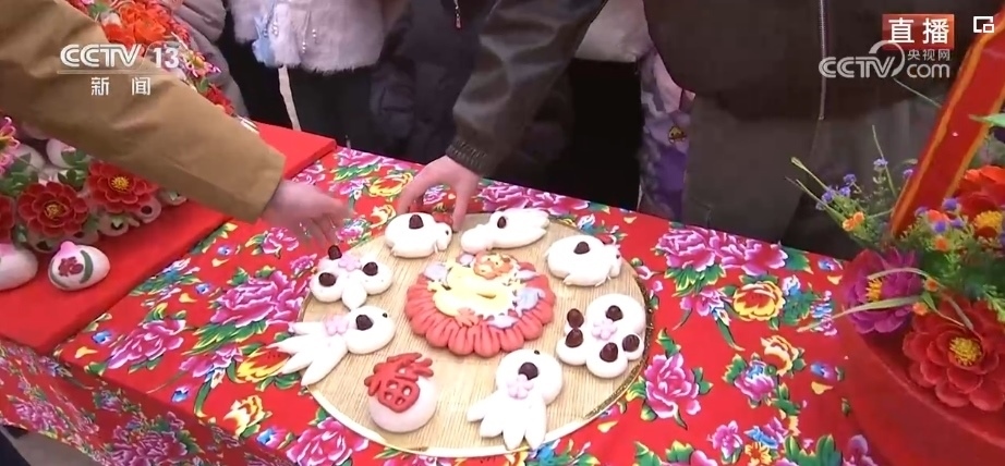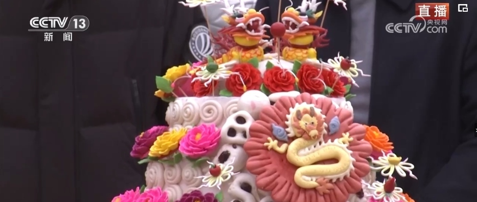 在春節(jié)期間,家家戶戶都會(huì)蒸年饃,每個(gè)年饃都有不同的寓意,花開(kāi)富貴、步步高升等,龍年特色的花饃非常熱銷(xiāo)。這個(gè)龍型年饃上彩色的元素都是可以食用的,黃色的身子是南瓜汁,藍(lán)色是當(dāng)?shù)匾环N茶葉水調(diào)出來(lái)的。
