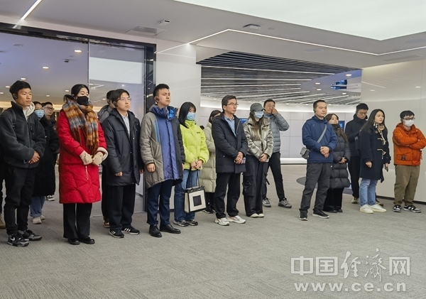 2023年12月18日,浙江大學(xué)師生代表隨團(tuán)在浙江杭州中國(guó)視谷調(diào)研。左二為浙江大學(xué)學(xué)生蔡安禧,左三為浙江大學(xué)學(xué)生金姚烗,左四為浙江大學(xué)馬克思主義學(xué)院教師陳曉偉。(中國(guó)經(jīng)濟(jì)網(wǎng)記者 王巖/攝)