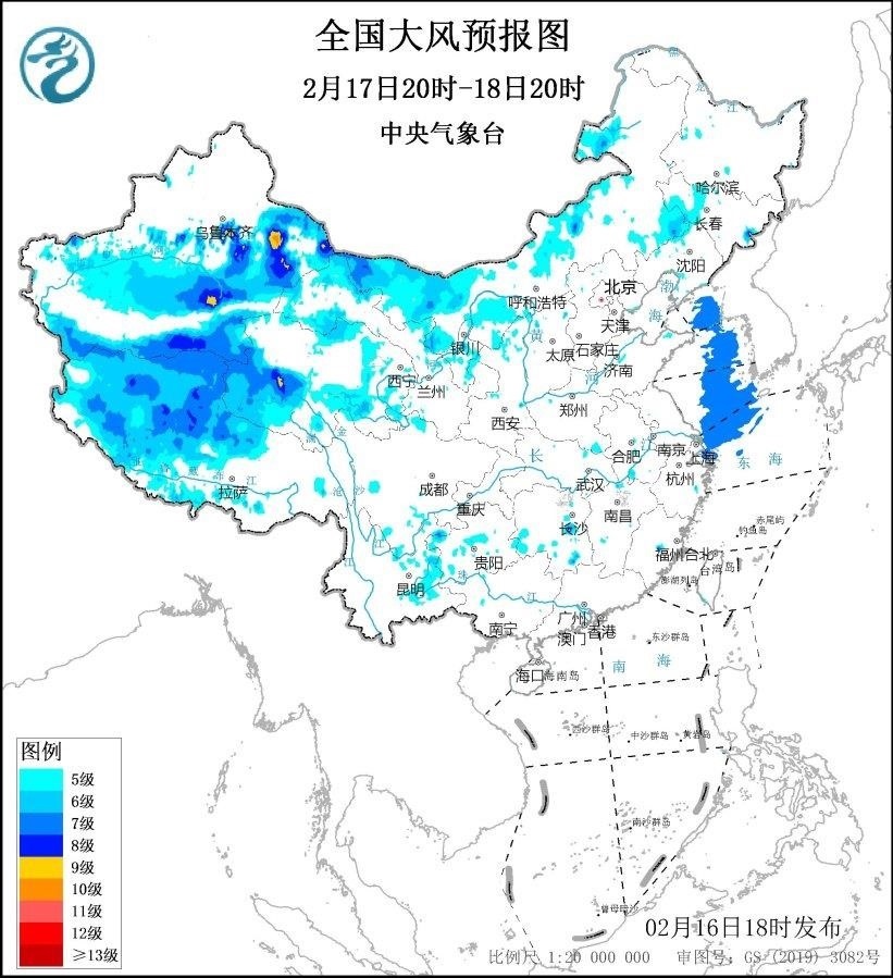 2月17日20時(shí)至18日20時(shí),新疆北疆東部和南疆盆地、內(nèi)蒙古西部、青海西南部、西藏西部、甘肅西部等地將有5~7級(jí)、陣風(fēng)8~9級(jí)的大風(fēng),新疆山口地區(qū)風(fēng)力可達(dá)10級(jí),陣風(fēng)12~13級(jí);黃海大部海域、東海北部海域?qū)⒂?級(jí)、陣風(fēng)8~9級(jí)的大風(fēng)。