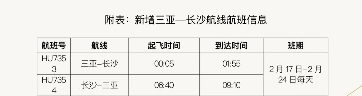 據悉,在民航局、海南省交通廳的支持下,海南航空積極協(xié)調申請加班計劃。2月17日至24日期間,海南航空每日新增三亞—長沙往返航班。去程航班HU7353,從三亞起飛時間為凌晨 00:05,到達長沙黃花國際機場時間為01:55;返程航班HU7354,從長沙起飛時間為06:40,到達三亞鳳凰國際機場時間為09:10,以上航班信息以實際查詢?yōu)闇?。旅客可通過海南航空官網及APP、微信公眾號及小程序、服務熱線95339、各直屬售票處及授權代理購買機票。