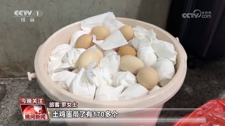 旅客 羅女士:土雞蛋帶了有170多個,給兒媳婦還有女兒她們一個拿一點,她們都在成都上班,老家?guī)н^來的土雞蛋味道不一樣,吃起來香嘛。