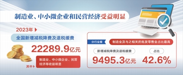 超2.2萬億元——這是2023年全國新增減稅降費(fèi)及退稅緩費(fèi)的總規(guī)模,其中超七成“落”于民營經(jīng)濟(jì),稅費(fèi)紅利精準(zhǔn)“落袋”,助企減負(fù)增活力。