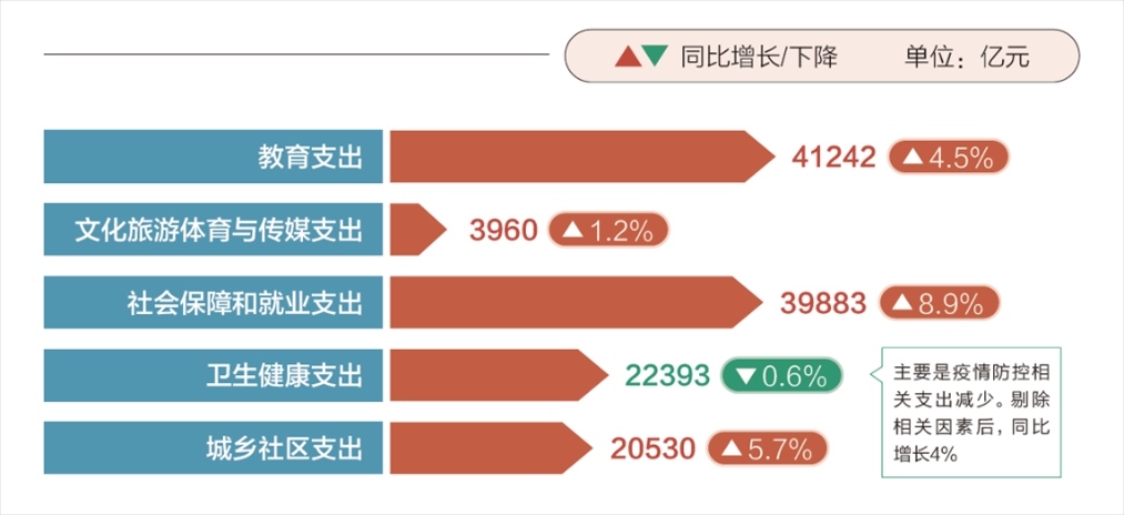 2023年,盡管財(cái)政收支壓力很大,但民生投入力度不減。超過27萬億元全國一般公共預(yù)算支出中,教育、社會(huì)保障和就業(yè)支出都在4萬億元上下,衛(wèi)生健康、城鄉(xiāng)社區(qū)支出都超過了2萬億元。