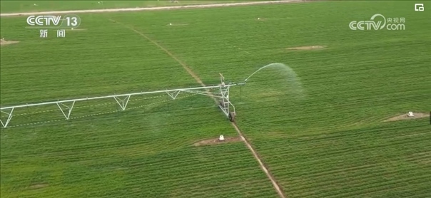 根據(jù)農(nóng)業(yè)專家的精準(zhǔn)測(cè)算和調(diào)度,園區(qū)工作人員啟動(dòng)了大型指針式噴灌機(jī)。