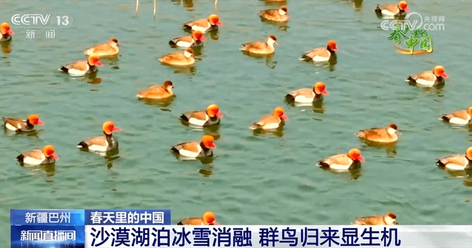 伴隨著陣陣鳥鳴,我們來到新疆巴州尉犁縣羅布淖爾國家濕地公園,碧綠的水面上,成群結(jié)隊的赤嘴潛鴨、赤麻鴨等鳥類時而用翅膀拍打水面展翅飛翔,時而三五成群在水中嬉戲、覓食,群鳥與黃沙、碧水、葦叢、胡楊交相輝映,形成一幅生機(jī)勃勃的春日畫卷。