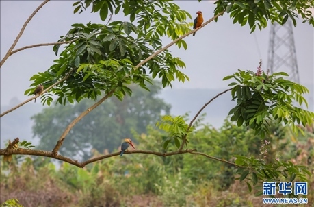 兩只鸛嘴翡翠同框 (4月2日攝)。新華網(wǎng)發(fā)(沙永勝 攝)