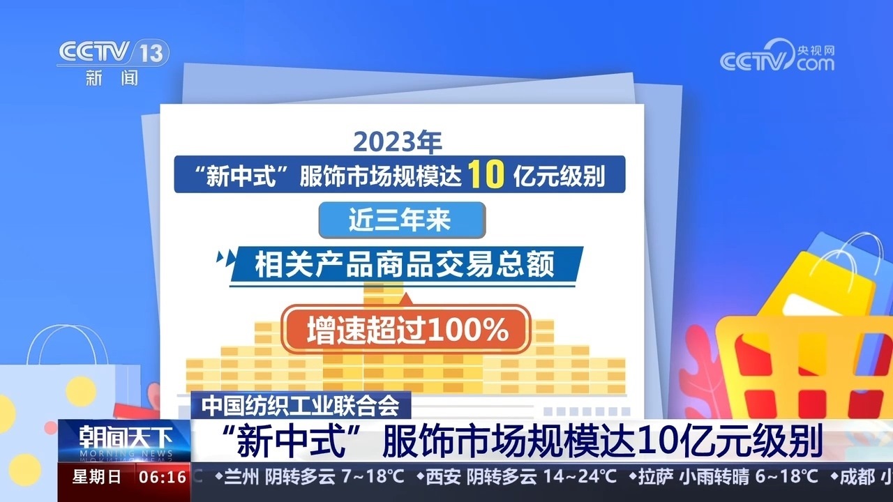 中國紡織工業(yè)聯(lián)合會數(shù)據(jù)顯示,2023年“新中式”服飾市場規(guī)模達(dá)10億元級別,近三年來,相關(guān)產(chǎn)品商品交易總額增速超過100%。今年1月以來,在互聯(lián)網(wǎng)銷售平臺上“新中式”“宋錦”的搜索量環(huán)比分別增長近6倍和近20倍。