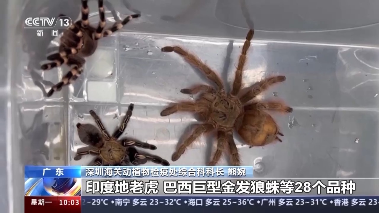 深圳海關(guān)動(dòng)植物檢疫處綜合科科長 熊婉:查驗(yàn)關(guān)員在對(duì)轉(zhuǎn)運(yùn)快件開展監(jiān)管時(shí),發(fā)現(xiàn)一票申報(bào)品名為“相機(jī)三腳架”的快件包裹機(jī)檢圖像異常,不符合相機(jī)三腳架的圖像特征,隨后進(jìn)行了開包查驗(yàn)。經(jīng)過專業(yè)機(jī)構(gòu)鑒定,這批活體蜘蛛是墨西哥金背紅尾蛛、印度地老虎、巨人偽鳴蛛、巴西巨型金發(fā)狼蛛等28個(gè)品種。