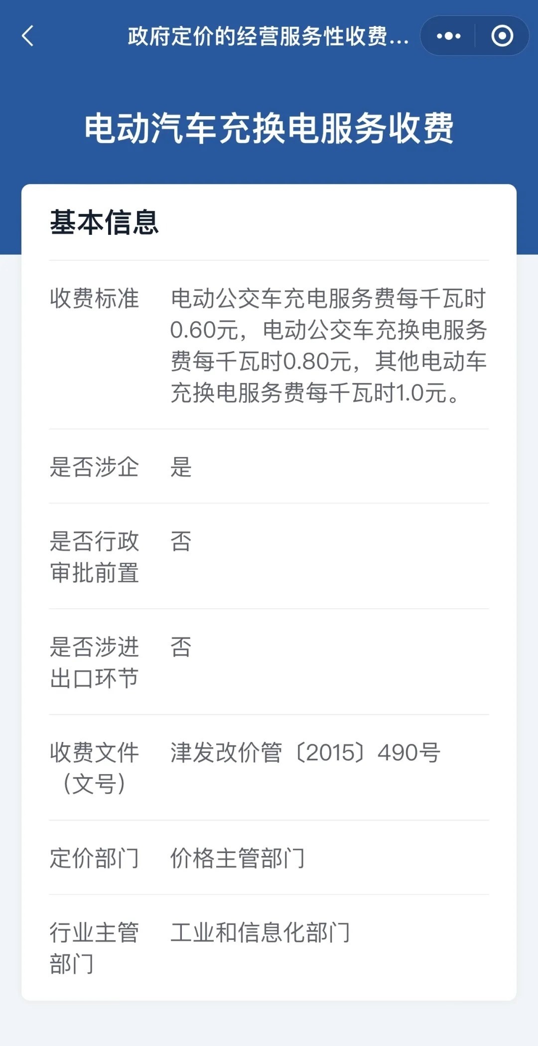 點擊定價項目名稱,就會看到具體的收費標(biāo)準(zhǔn)、收費文件、定價部門、行業(yè)主管部門、是否涉企等多項信息。