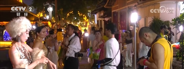 夜幕降臨,在西雙版納景洪市的告莊景區(qū)里,很多游客身著民族服飾,化著精致的妝容,正在攝影師的指導(dǎo)下拍攝寫真。
