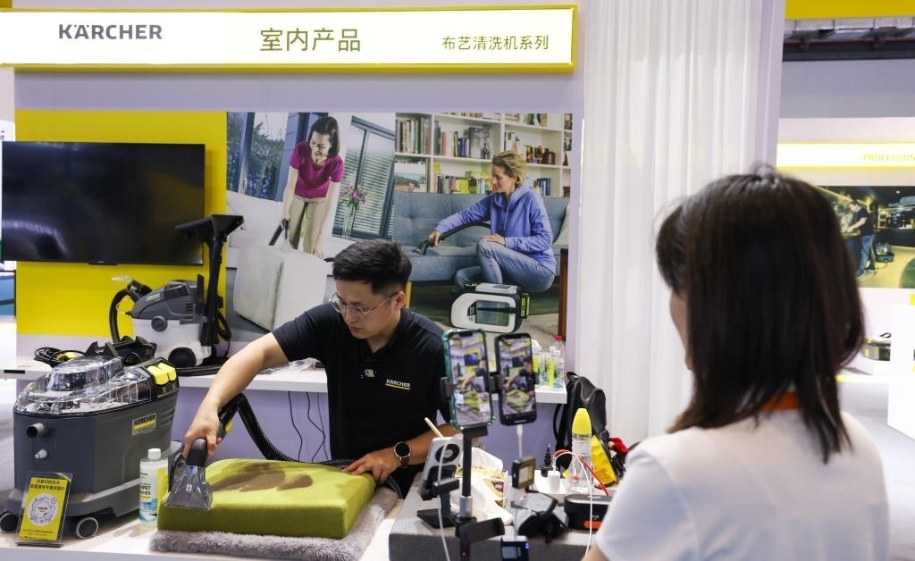 “友友們,現(xiàn)在進(jìn)入‘云’逛消博會(huì)時(shí)間,大家可以通過(guò)直播試擦,感受這款鏡面清潔機(jī)的功能?!币贿呍谡古_(tái)發(fā)布新品,一邊引導(dǎo)消費(fèi)者進(jìn)入直播間購(gòu)買(mǎi),卡赫現(xiàn)場(chǎng)工作人員陳女士忙得不亦樂(lè)乎。據(jù)她介紹,這是公司第一次在消博會(huì)上使用直播帶貨形式,“效果不錯(cuò),剛剛就有不少粉絲下單”。