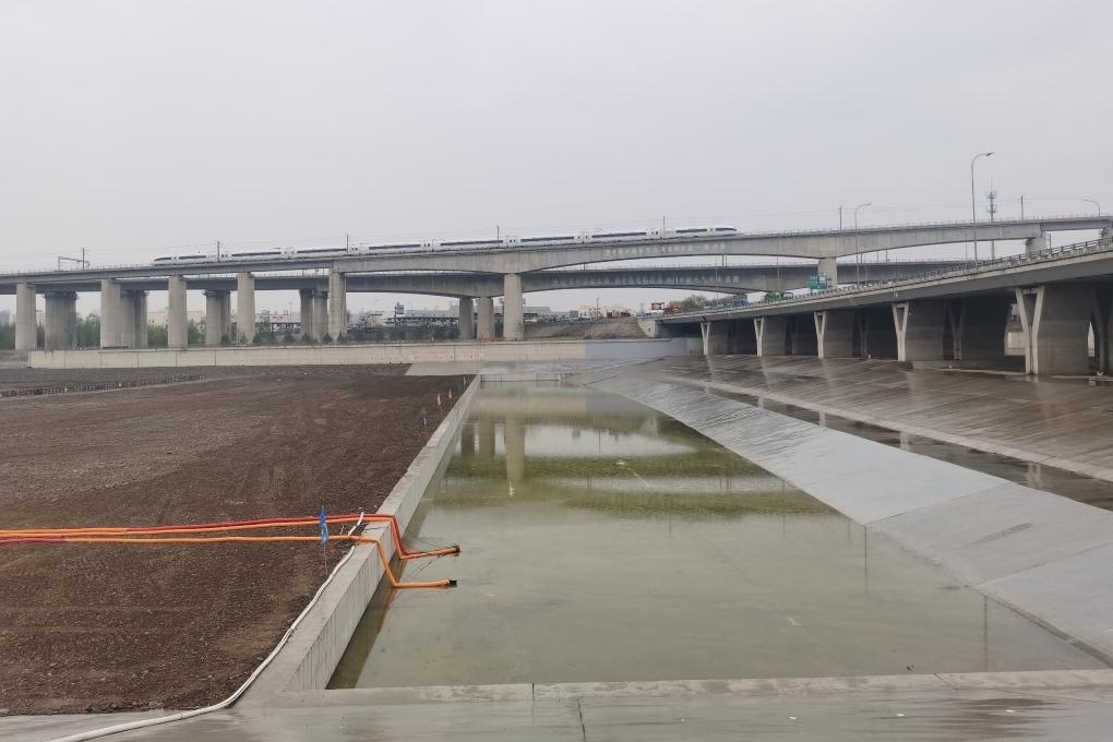 永定河京港澳高速公路大橋南,大寧調蓄水庫水毀修復工程施工現(xiàn)場,記者看到,新建的消力池已經建好,所有實體工程已經完工,一些工人正在做收尾清理工作。