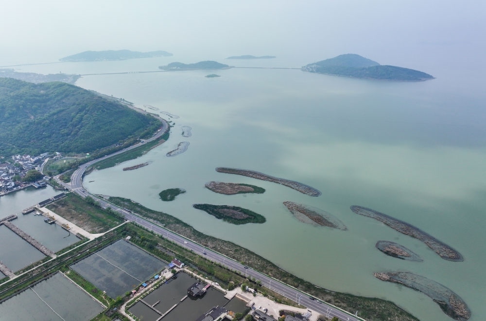 這是江蘇省蘇州市吳中區(qū)金庭鎮(zhèn)環(huán)太湖濕地帶修復(fù)項目(2024年4月11日攝,無人機(jī)照片)。