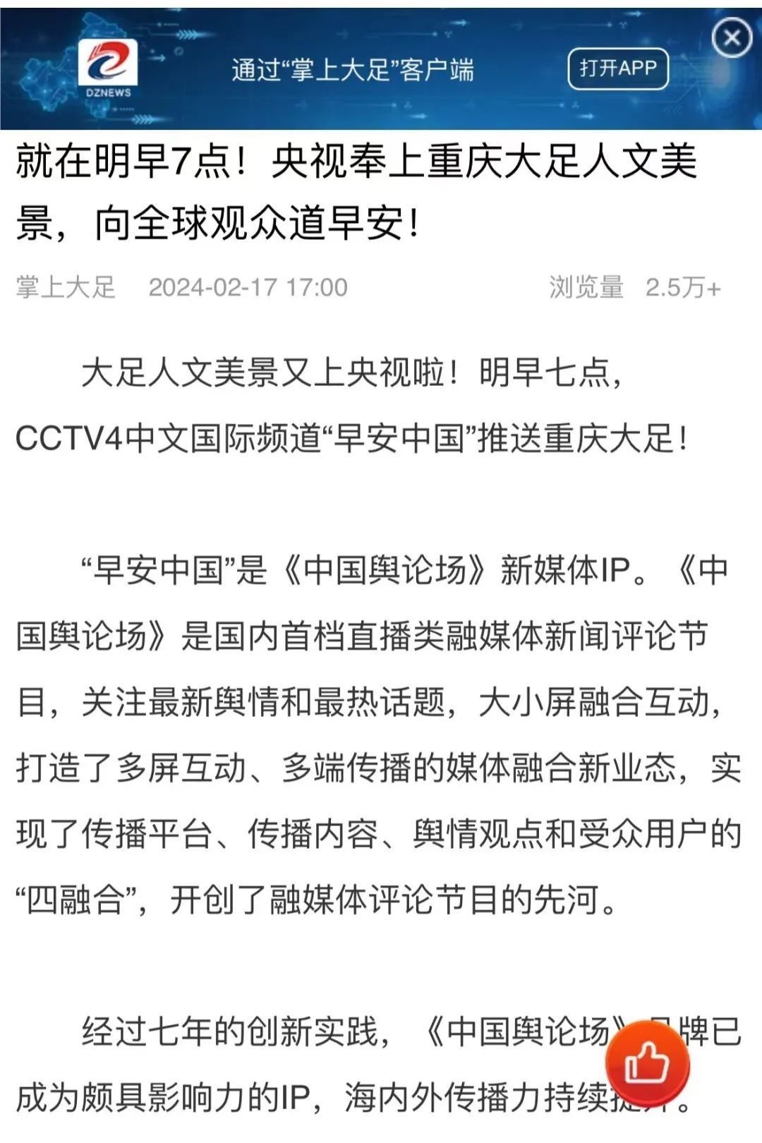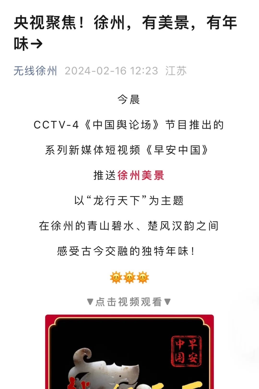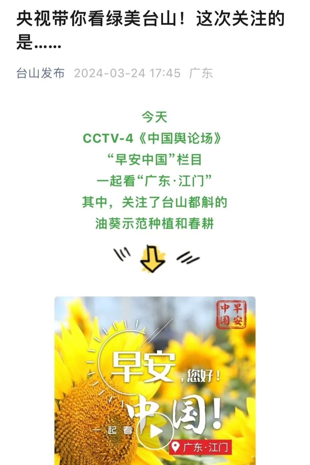 “央視帶你看綠美臺山,這次關(guān)注的是......”“就在明早7點!央視奉上重慶大足人文美景,向全球觀眾道早安!”“央視聚焦!徐州,有美景,有年味”“金葵向陽開,中春好景和風裁!美麗江門與您相遇央視《早安中國》”……越來越多的地方政府伸出橄欖枝,希望《早安中國》多“來”當?shù)匾挥[好風光。