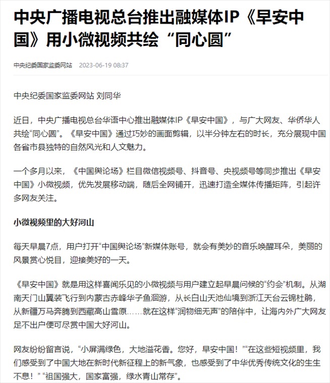 一年后的今天,《早安中國》不僅讓越來越多的網(wǎng)友在每天早晨7:00習(xí)慣性地用“早安”短視頻跟親朋好友道聲問候、來場“約會”,更重要的是它將總書記喜歡的典故與中國各地獨特的自然和人文景觀相結(jié)合,與海外華僑華人建立起有效連接。
