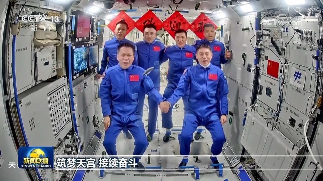 隨后,兩個(gè)航天員乘組拍下“全家?!保餐驙繏焖麄兊娜珖嗣駡?bào)平安。