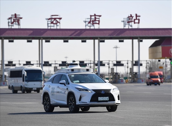 一輛自動駕駛車行駛在北京大興國際機場到亦莊的自動駕駛線路上(2024年3月1日攝)。新華社記者 鞠煥宗攝