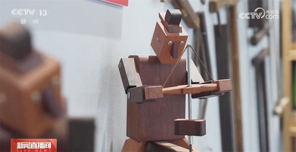 山東省非物質文化遺產“橋氏木作”技藝傳承人喬一兵在工作站里也有自己的工作室,他用一整塊木料,不用一釘一鉚,制作魯班枕結構的系列用品。
