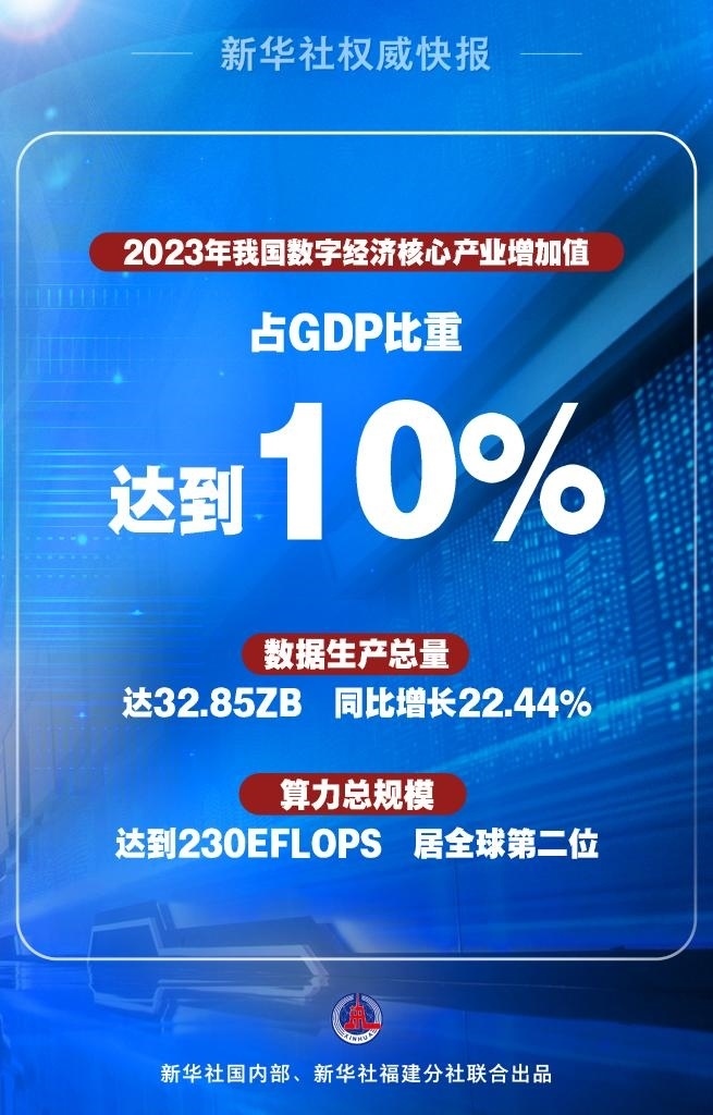 2023年我國數(shù)字經(jīng)濟保持穩(wěn)健增長,數(shù)字經(jīng)濟核心產(chǎn)業(yè)增加值占GDP比重達(dá)到10%。數(shù)據(jù)要素市場日趨活躍,2023年數(shù)據(jù)生產(chǎn)總量達(dá)32.85ZB(1個ZB等于十萬億億字節(jié)),同比增長22.44%。數(shù)字基礎(chǔ)設(shè)施不斷擴容提速,算力總規(guī)模達(dá)到230EFLOPS(EFLOPS是指每秒百億億次浮點運算次數(shù)),居全球第二位。