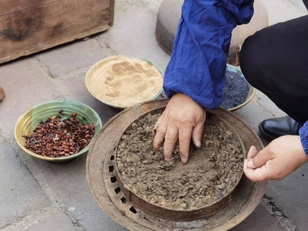 沖好針孔,便在磨石上反復(fù)銼尖。隨后倒入熱鍋里翻炒,再舀入一瓢水,針的剛性和硬度由此增加。接下來(lái)便輪到三大碗“大陽(yáng)秘方”登場(chǎng):白崖土粉末、松木炭和發(fā)酵后的豆豉,用于蒸針?!八赡咎靠梢栽黾愉撫樀暮剂浚嵘捕?;豆豉增加亮度;白崖土粉末作為分散劑讓針受熱均勻。這樣處理后可以保證針質(zhì)更堅(jiān)硬又有光澤。”