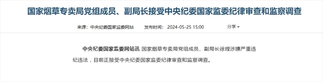 央視網(wǎng)消息:中央紀委國家監(jiān)委網(wǎng)站消息,國家煙草專賣局黨組成員、副局長接受中央紀委國家監(jiān)委紀律審查和監(jiān)察調(diào)查。