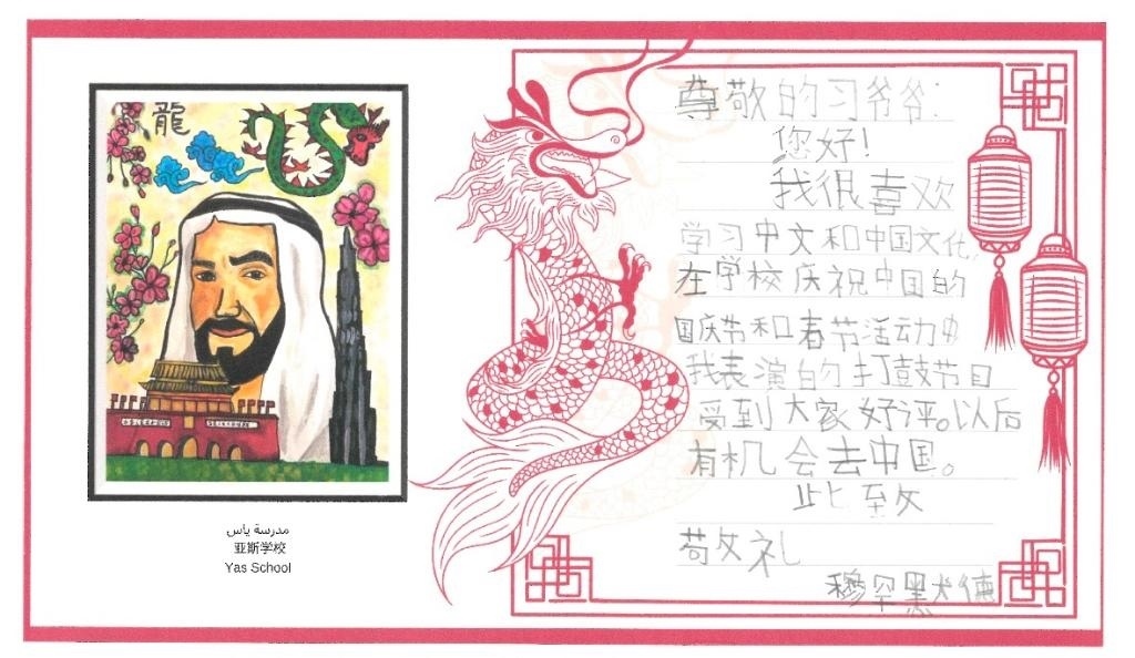 想邀請習爺爺來阿聯(lián)酋、想和習爺爺踢一場足球賽、希望能在阿聯(lián)酋動物園里看到大熊貓……在這些精心制作的信箋里,孩子們用中文一筆一劃認真書寫自己的心里話,童心與真情躍然紙上。長城、中國龍、大熊貓、祥云、燈籠,孩子們還用五彩斑斕的畫筆表達自己對中國的向往和喜愛,可謂圖文并茂,賞心悅目。