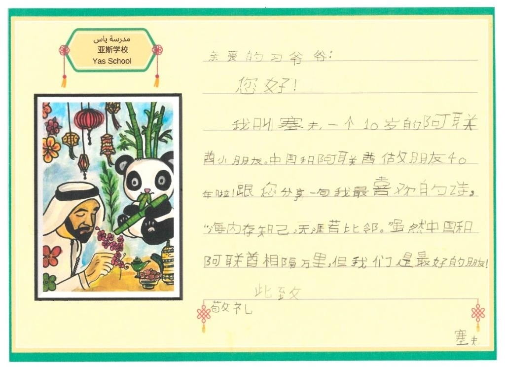 10歲的塞夫就讀于阿聯(lián)酋規(guī)模最大的公立學校亞斯學校。他在信中與習爺爺分享自己最喜歡的一句中國古詩——“海內存知己,天涯若比鄰”,因為“雖然中國和阿聯(lián)酋相隔萬里,但我們是最好的朋友!”