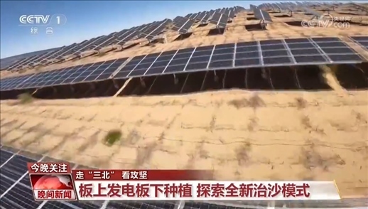 總臺(tái)記者 李欣蔓:治沙的腳步不但沒(méi)有停,還在不斷探索新的治沙模式?,F(xiàn)在我們看到的是鄂爾多斯一個(gè)已經(jīng)建好、并網(wǎng)發(fā)電的光伏項(xiàng)目,板上發(fā)電,板下種植,一個(gè)空間全方位利用。三重防線(xiàn),構(gòu)建起了全新的生態(tài)治沙模式。有一個(gè)數(shù)據(jù)值得我們關(guān)注,這里的光伏項(xiàng)目占地39萬(wàn)畝,與此同時(shí),生態(tài)治理面積也將規(guī)劃完成39萬(wàn)畝。在國(guó)家推進(jìn)光伏治沙項(xiàng)目開(kāi)發(fā)建設(shè)的進(jìn)程中,我們看到越來(lái)越多的企業(yè)參與其中,在發(fā)展新能源產(chǎn)業(yè)的同時(shí)共同擔(dān)負(fù)起治沙的責(zé)任,為一片藍(lán)海,一片綠洲的建設(shè),貢獻(xiàn)更多的力量。