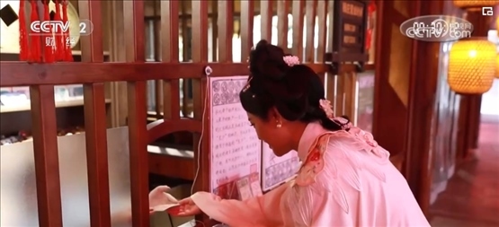 在宋城景區(qū)入口處的漢服妝造館里,游客們正在挑選服裝。穿上漢服,游客們就可以到景區(qū)的打卡點(diǎn),兌換宋代紙幣——交子,體驗(yàn)宋代人的日常生活。