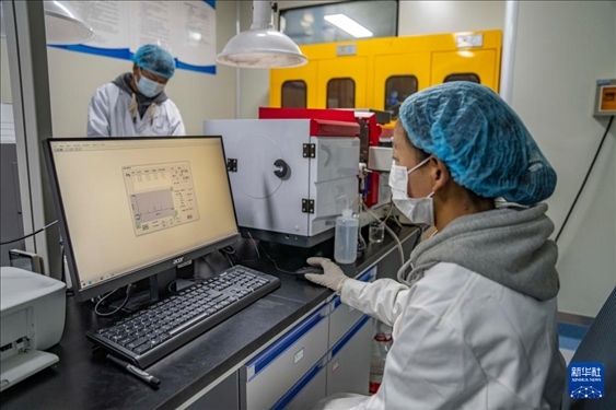 ?在聶榮縣嘎確生態(tài)畜牧業(yè)發(fā)展有限責任公司,檢驗員達娃卓瑪在檢測奶制品(5月13日攝)。新華社記者 孫非 攝