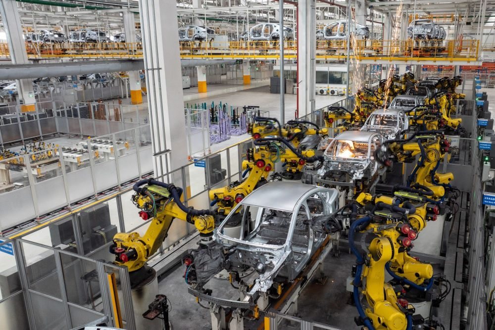 2024年3月21日,比亞迪湖南長沙雨花工廠機械臂在焊接車身。