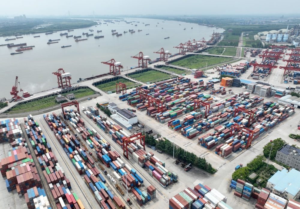 2024年6月1日拍攝的湖北武漢陽(yáng)邏港(無(wú)人機(jī)照片)。2013年時(shí),陽(yáng)邏港僅有兩條集裝箱航線,船型小、班期少;如今,陽(yáng)邏港已開(kāi)通各類集裝箱航線20余條,實(shí)現(xiàn)“航運(yùn)向東入海、班列向西入歐”。
