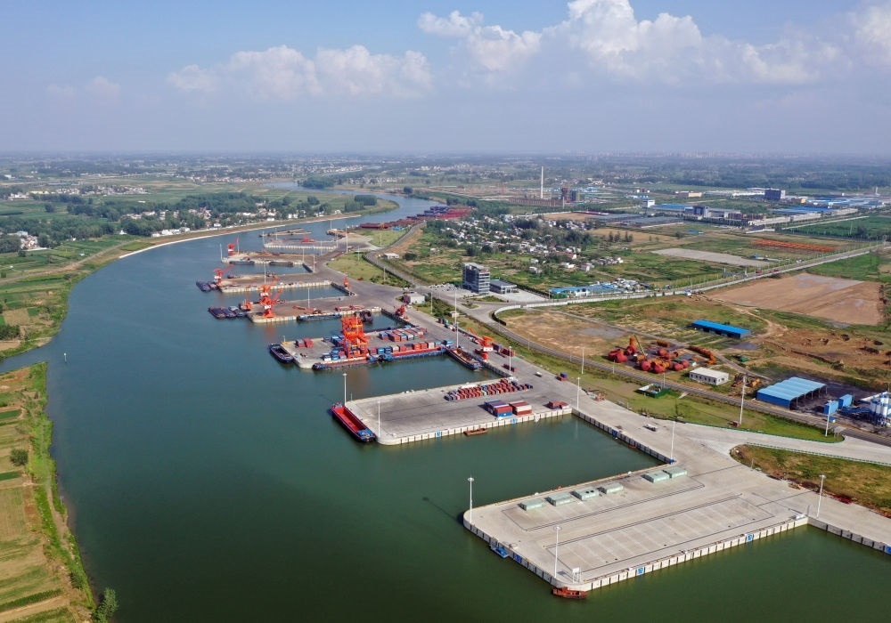 2022年6月28日拍攝的河南周口中心港碼頭(無(wú)人機(jī)照片)。近年來(lái),河南積極推進(jìn)沙潁河航道升級(jí)改造,疏通內(nèi)河航運(yùn)?,F(xiàn)在,從周口中心港出發(fā)的船舶可經(jīng)沙潁河至淮河、京杭大運(yùn)河駛?cè)腴L(zhǎng)江,讓內(nèi)陸城市亦能通江達(dá)海。