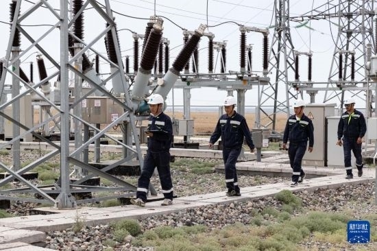 6月25日,在哈薩克斯坦阿拉木圖州謝列克風電場,中哈運行人員進行巡檢。白雪騏 攝