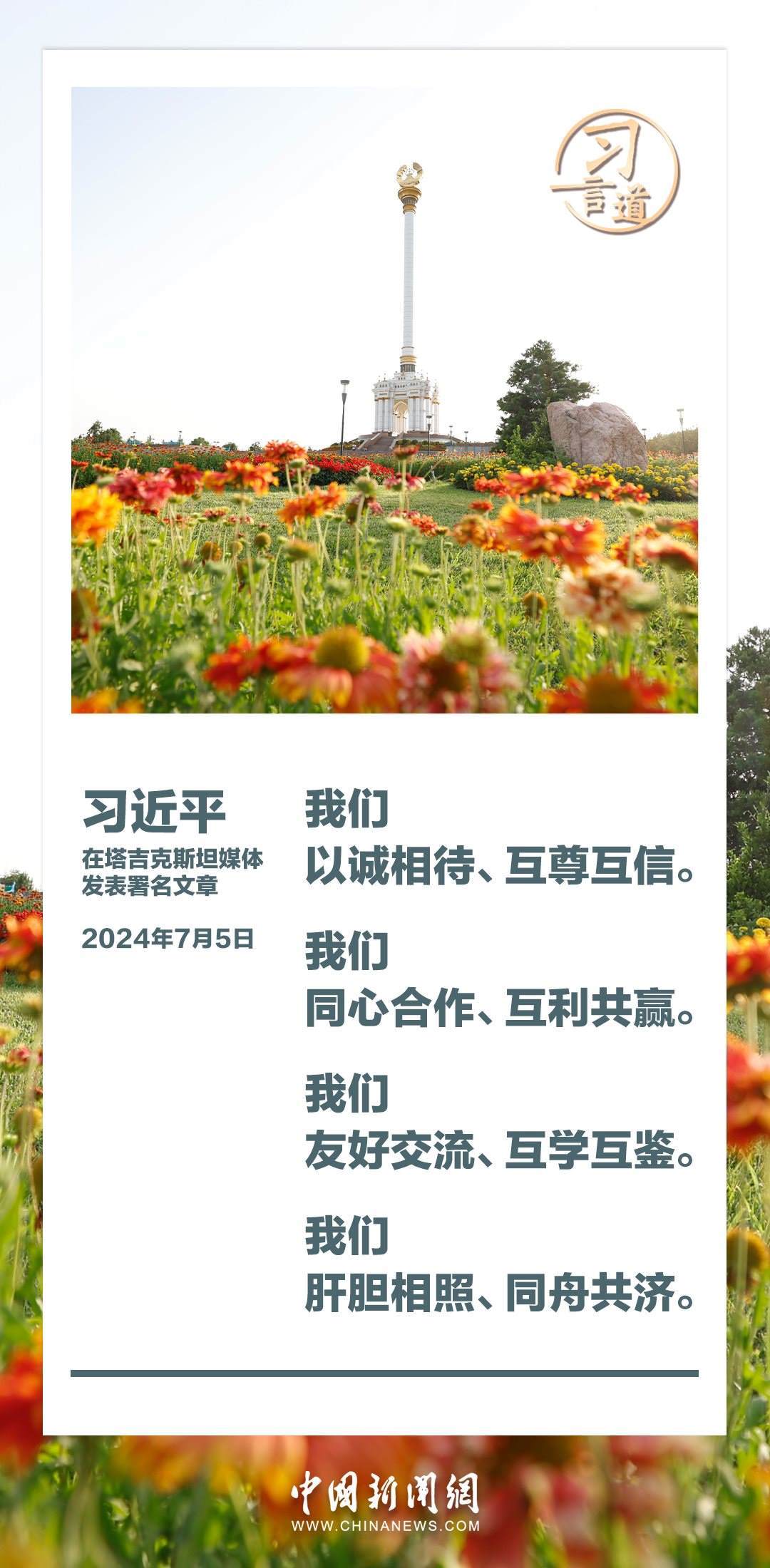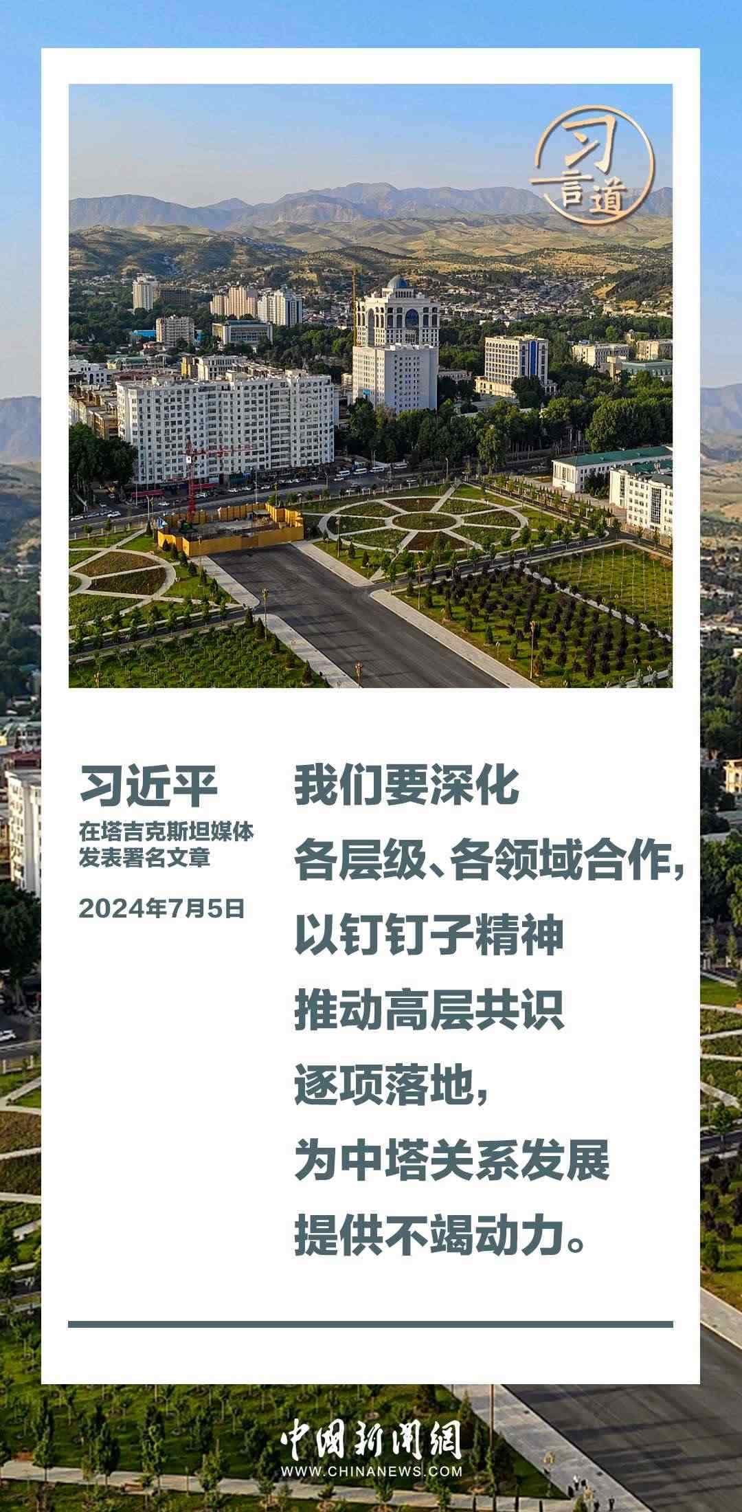 7月5日,在對(duì)塔吉克斯坦進(jìn)行國(guó)事訪問之際,國(guó)家主席習(xí)近平在塔吉克斯坦《人民報(bào)》和“霍瓦爾”國(guó)家通訊社發(fā)表題為《共創(chuàng)中塔關(guān)系美好明天》的署名文章。習(xí)近平指出——