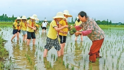 聽完講解,就來到了同學(xué)們最期待的插秧體驗(yàn)環(huán)節(jié)。農(nóng)田兩側(cè),幾捆嫩綠的秧苗已經(jīng)備好。大家脫下鞋襪、挽起褲腳,走進(jìn)水田?!坝沂帜粗?、食指、中指并攏,護(hù)住秧苗須根,輕輕插進(jìn)泥土里?!苯剐〔ㄟ呎f邊示范,“大家也要像秧苗一樣不斷向下扎根,才能夠茁壯成長(zhǎng)?!?/P>