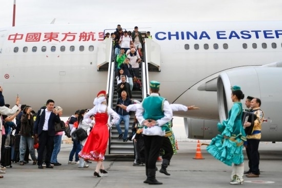 9月28日,東航“上海-喀山”直飛首航航班的旅客抵達俄羅斯韃靼斯坦共和國喀山國際機場。新華社記者 曹陽 攝