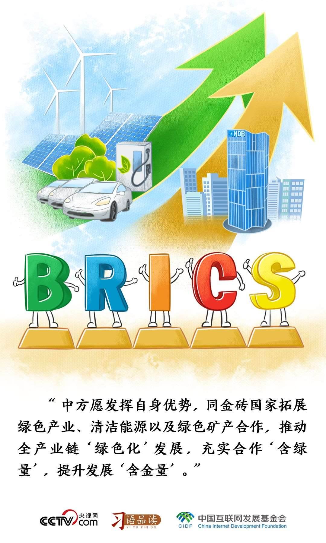 習(xí)主席強(qiáng)調(diào),中方愿同金磚國家拓展綠色產(chǎn)業(yè)、清潔能源以及綠色礦產(chǎn)合作,推動(dòng)全產(chǎn)業(yè)鏈“綠色化”發(fā)展,充實(shí)合作“含綠量”,提升發(fā)展“含金量”。