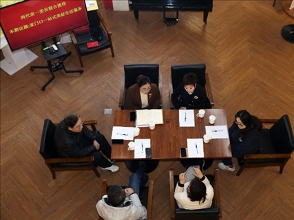 2023年2月17日,上海市長寧區(qū)虹橋街道古北市民中心主任盛弘和居民代表討論社區(qū)服務功能的相關議題。新華社記者 劉穎 攝