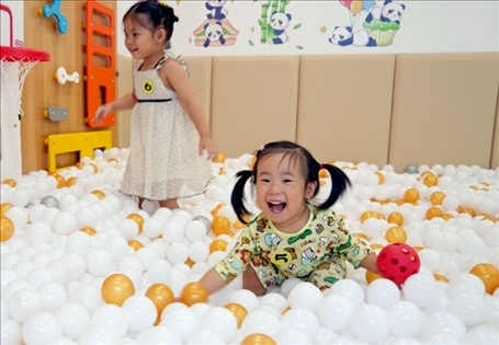 上海市靜安區(qū)江寧路街道社區(qū)黨群服務中心內的“寶寶屋”,小朋友們在玩耍(2022年9月27日攝)。新華社記者 劉穎 攝
